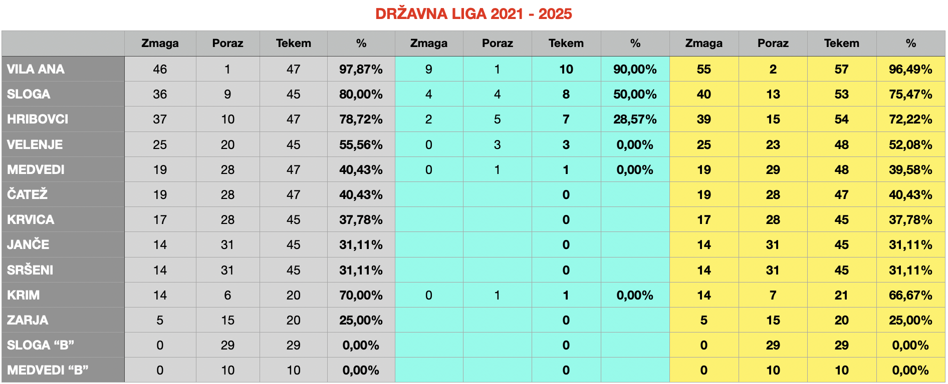 Analizo zadnjega petletnega obdobja zaključujem s pregledom ligaškega tekmovanja. Ob pregledu zadnje petletke lahko ugotovimo, da je ligaško državno prvenstvo potekalo v znamenju Vila Ane, vrhunske zvezdniške petankarske zasedbe iz ljubljanskega Polja. V temu obdobju so nanizali kar 55 zmag in doživeli le dva poraza. Enega lani v rednemu delu tekmovanja, tistega bolj bolečega pa v sezoni 2023 v finalu končnice. Poleg Vila Ane so stalnica v končnici še ljubljanska Sloga in Hribovci iz Dolskega. Medtem ko je Slogašem v sezoni 2023 uspelo priti do svojega skupaj enastega naslova državnih prvakov, pa Hribovci na novo zvezdico čakajo vse od leta 2015. Kar trikrat v zadnjih petih letih so se v končnico zavihteli Velenjčani, po enkrat pa Medvedi in Krim, ki pa ga žal ni več v konkurenci.